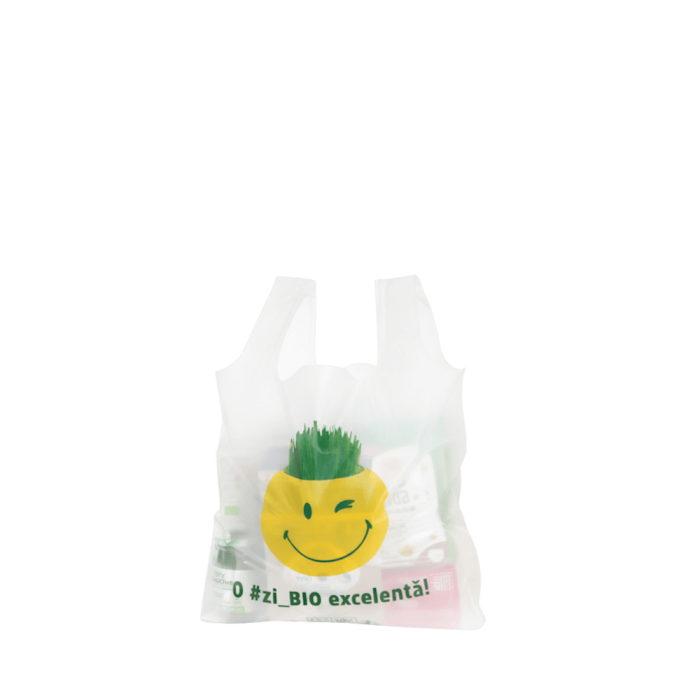 Pungile biodegradabile tip maieu 'O Zi Bio Excelenta' sunt ideale pentru supermarketuri sau magazine de cartier, magazine naturiste, bacaniii, restaurante traditionale sau fast food, street food, piete agroalimentare, patiserii - simigerii, cofetarii, pizzerii. Fabricate din materiale compostabile de calitate, aceste pungi ofera un echilibru intre durabilitate si sustenabilitate, garantand conformitatea cu normele de mediu europene.
